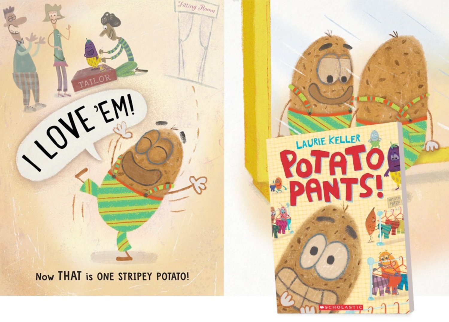 This got me thinking about the laugh-out-loud picture book Potato Pants! by Laurie Keller. Potato is so excited about a one-day-only sale at Lance Vance’s Fancy Pants Store. Even though Potato makes it to the store on time, his eggplant nemesis stops him from buying a brand-new set of trousers. But what kind of pants do potatoes wear? According to this fashionable picture book, the possibilities are endless.