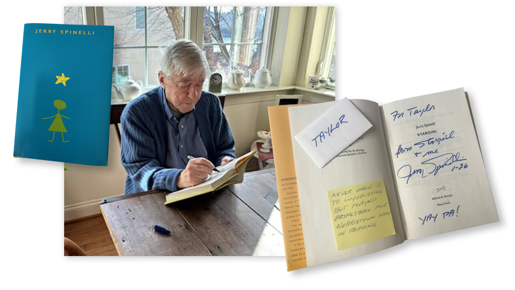 Stargirl is also one of my favorite books, and Stargirl’s author, Jerry Spinelli, is a dear friend of mine, an amazing writer, and a truly wonderful person. So, I thought it would be fun to celebrate Taylor’s love of Stargirl and her passion for reading and asked Jerry to autograph a special copy of Stargirl for Taylor.
