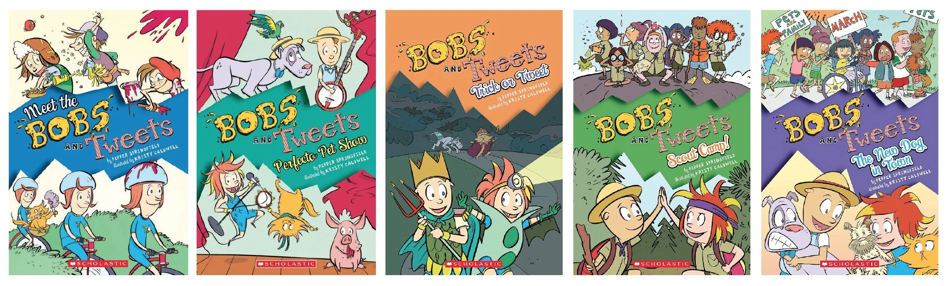There are five books in the series, published by Scholastic: Meet the Bobs and Tweets; Perfecto Pet Show; Trick or Tweet; Scout Camp!; and The New Dog in Town. They are illustrated by the brilliant and truly lovely award-winning kids’ book illustrator, Kristy Caldwell. I am working on the sixth book in the series, which is taking a while to come together, but I hope to be out with it someday soon.